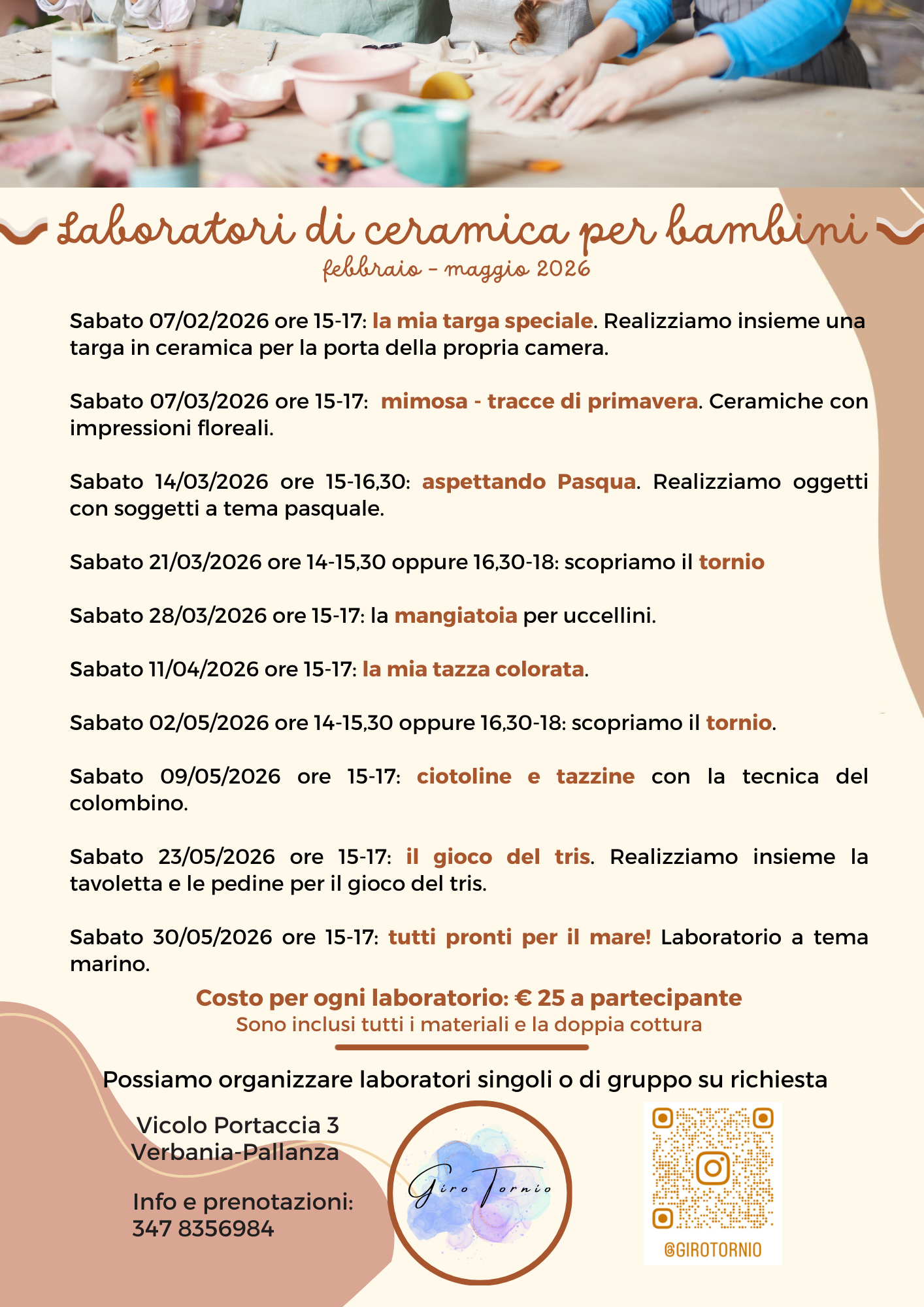 Le attività sono pensate come esperienze accessibili e piacevoli, adatte a chiunque voglia avvicinarsi alla ceramica in modo semplice e pratico, senza bisogno di alcuna esperienza precedente.