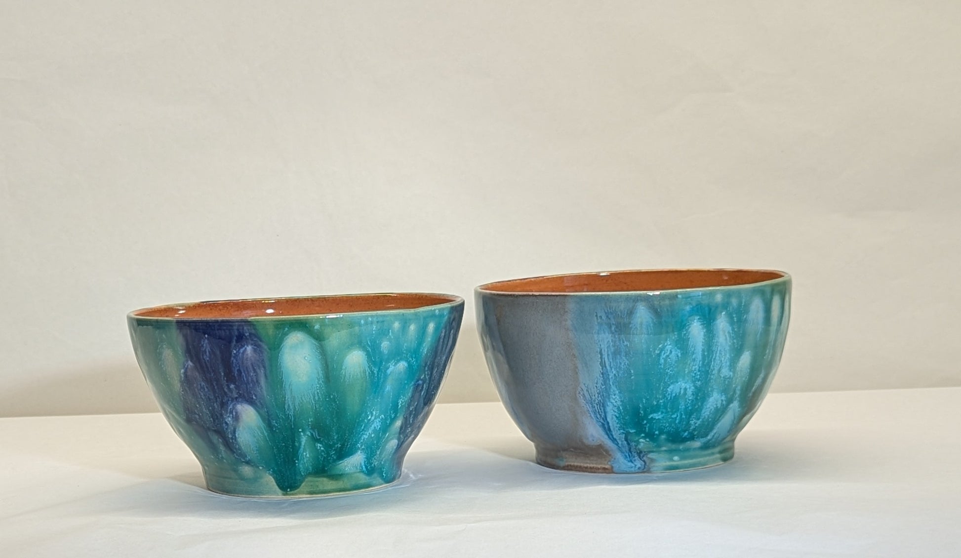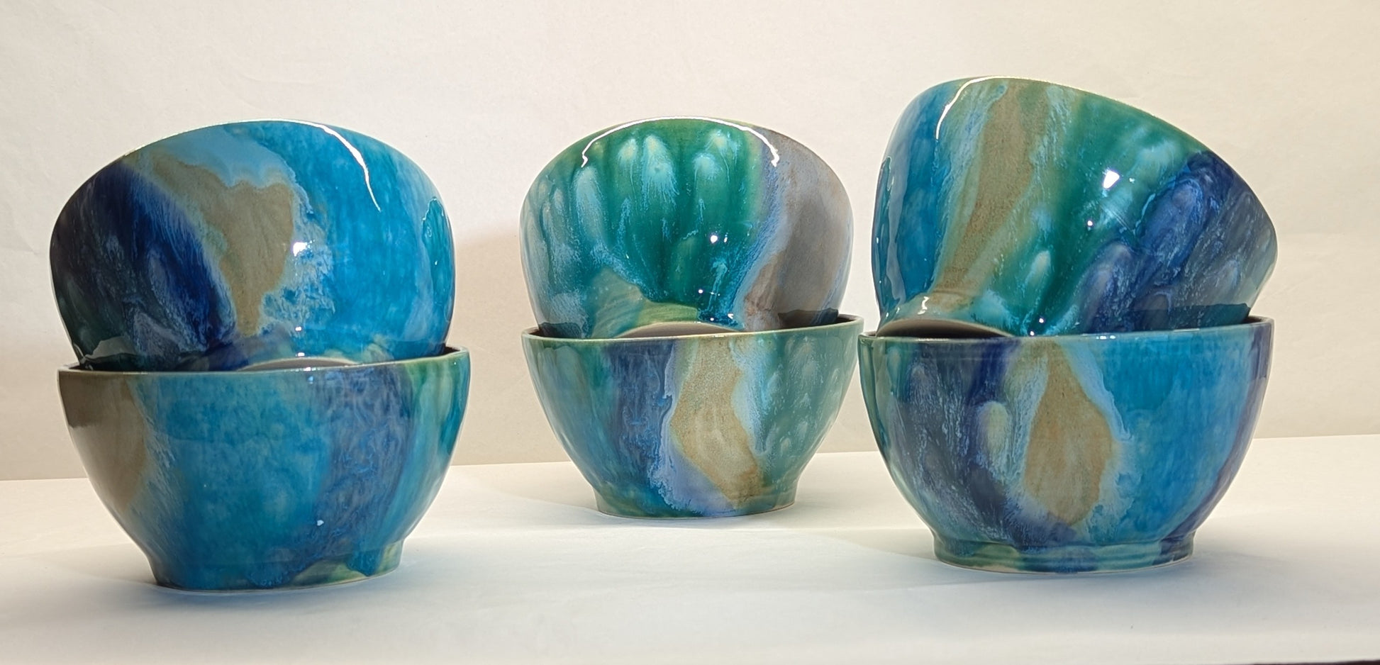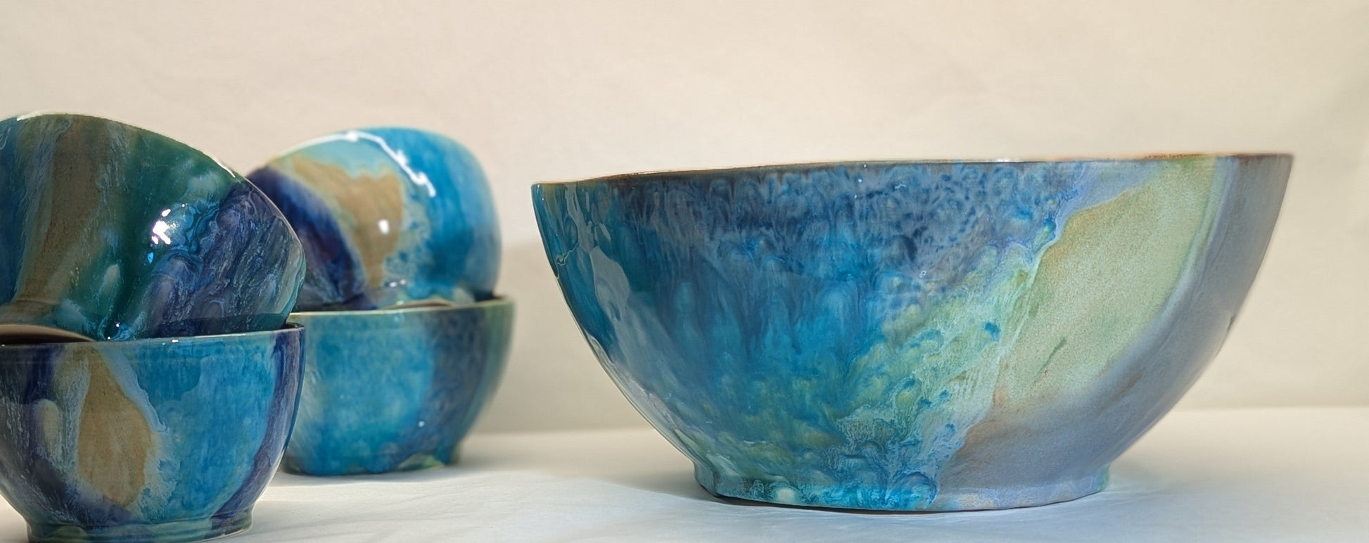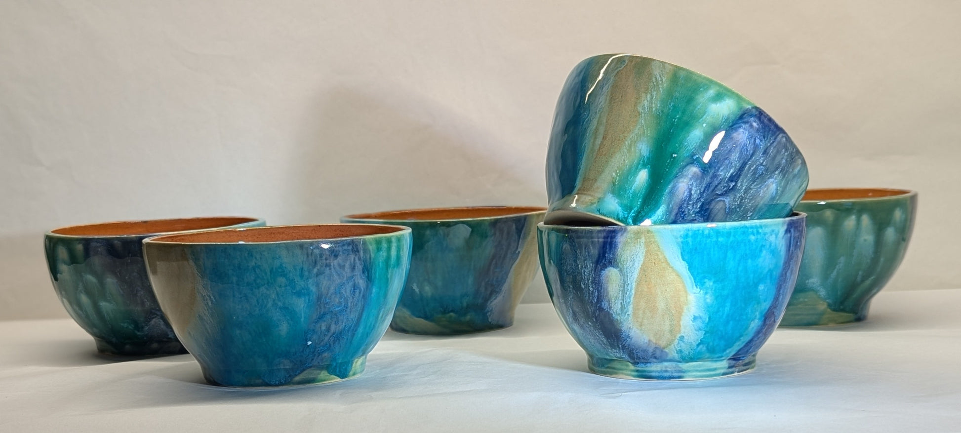 Servizio composto da 6 ciotoline e una ciotola grande, in ceramica smaltata con colori marini, dall'azzurro al blu al sabbia.